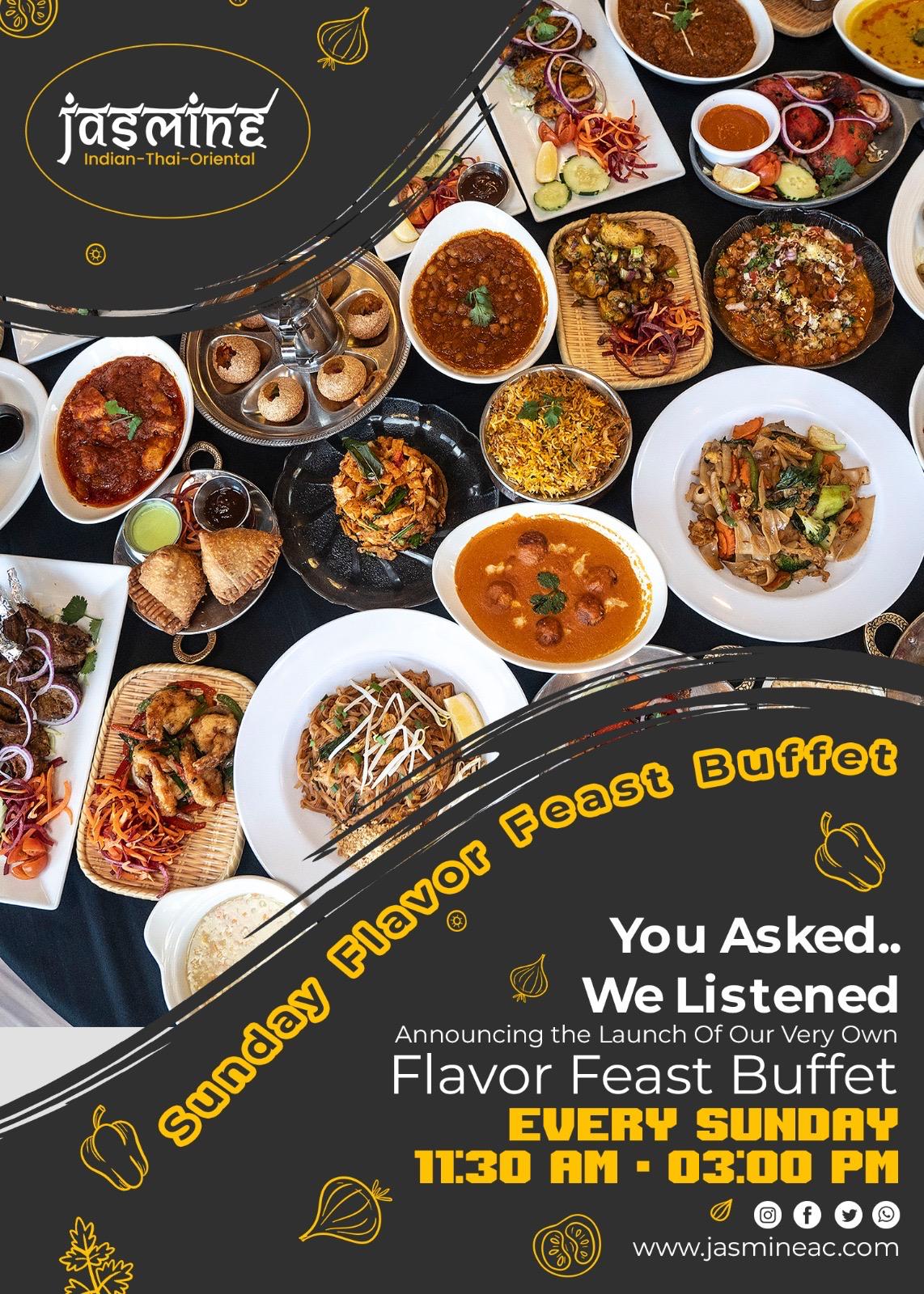 Get ready to treat your taste buds at Jasmine Indian-Thai-Oriental with the launch of our much-awaited Sunday Flavor Feast Buffet — now happening every Sunday from 11:30 AM to 3:00 PM.